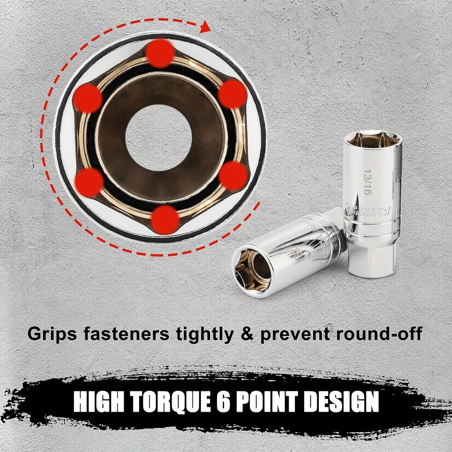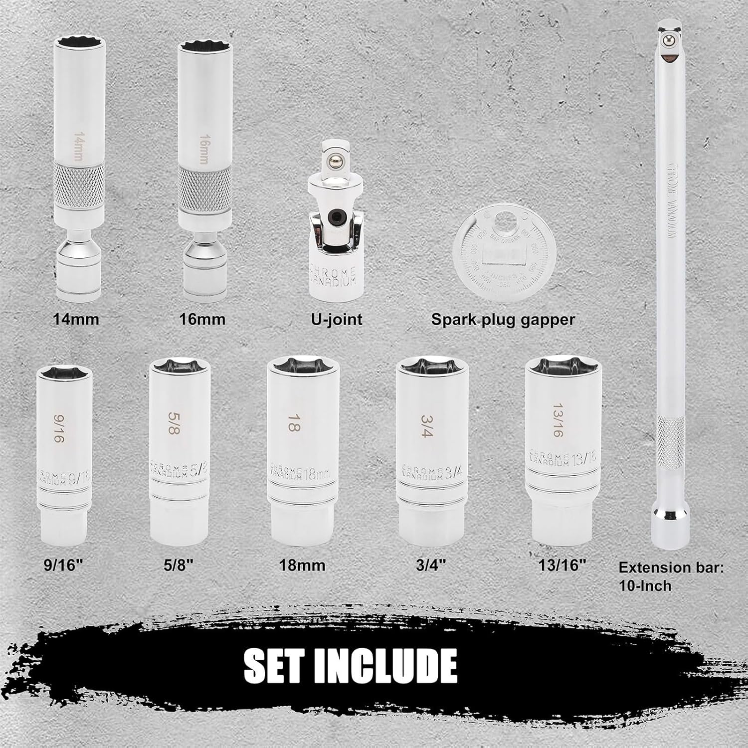 This 10-piece spark plug socket set is your all-in-one solution for efficient and professional spark plug service. Designed for DIY enthusiasts and mechanics, it tackles a wide range of SAE and metric spark plug sizes. The kit includes essential tools: a 10" extension bar for extra reach, a universal joint adapter, and a spark plug gapper for setting the correct electrode gap. The highlight is the two 12-point, 360-degree swivel sockets (14mm & 16mm), providing unmatched flexibility in tight engine compartments. All sockets are forged from durable 50BV30 Chrome Vanadium Steel and finished with a mirror polish to resist wear and corrosion. Organized in a sturdy, compact case, this complete set offers exceptional value and convenience, ensuring you have the right tool for the job every time.
