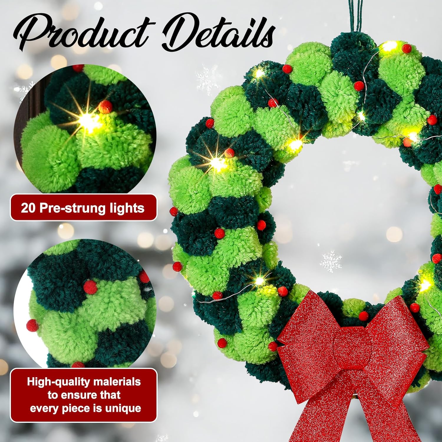 Features: Wreaths ornaments can be hung from entrances, placed on mantels, applied to adorn cards and gifts, or exhibited as decorations on a Christmas tree, wreath, or festive centerpiece. The LED wreaths are brighter. Warm LED lights enhance the Christmas wreath's beauty and appeal at night, adding to its charm throughout the holiday season. Specifications: Material: pompom, wool Color: red, green Size: about 16 inch/40 cm diameter Package includes: 1 x Pom pom wreath 1 x Warm white LED string light (No Battery) Notes: Manual measurement, please allow slight errors on size. The color may exist a slight difference due to different screen displays Battery type: 2 x AA, the Christmas wreath needs 2AA batteries (not included)
