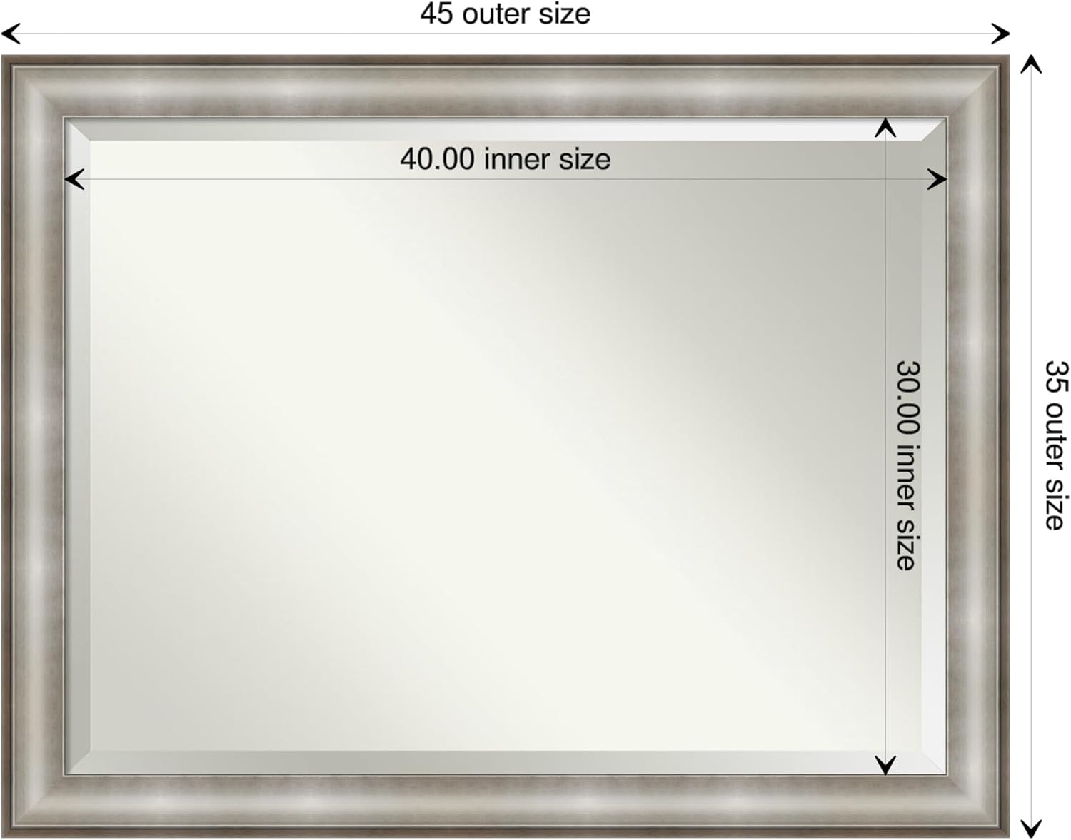 PRODUCT: Amanti Art Beveled Wall Mirror; OUTER SIZE: Exactly 45 x 35 inches; FRAME: Imperial Silver; FRAME FINISH: Brushed Nickel; FRAME COLOR: Silver. The Imperial Silver frame is a brushed warm silver frame with an outer ledge and a raised profile that scoops to the inner edge. Give your home or office the finishing touch with this framed wall mirror. Individually made using traditional custom framing techniques, it has the quality you would expect from your local frame shop. It holds its value with premium finishing that can be appreciated up close. Because of our attention to detail and focus on artistry, architects, interior designers, and homeowners alike choose this mirror to create beautiful living spaces.