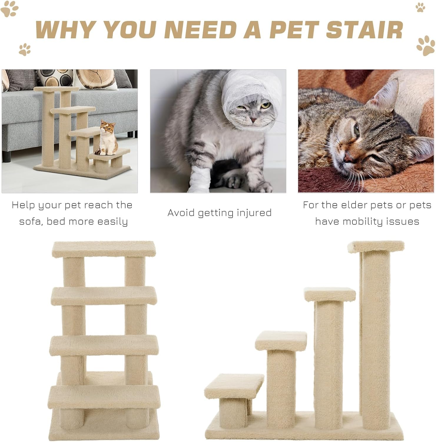 This multi-level cat stairs and scratching post combination provides your feline companion with an engaging activity center that satisfies natural instincts while serving a practical purpose. Featuring four carpeted steps supported by eight sisal-wrapped posts, this 25-inch long by 17-inch wide by 24-inch high structure helps cats reach elevated surfaces like beds and sofas with ease. The design is particularly beneficial for senior cats, kittens, or small breeds that may struggle with jumping to higher locations, reducing strain on joints while maintaining independence. Each platform is covered in soft plush fabric that's gentle on paws yet durable enough for scratching, climbing, and resting. Constructed from sturdy particle board with a reinforced base, this pet furniture supports cats up to 44 pounds and includes an anti-toppling safety strap for secure installation. The neutral brown finish blends seamlessly with most home decor, while the compact footprint makes it ideal for apartments and smaller living spaces. Assembly is straightforward with included hardware and illustrated instructions. Whether your cat needs mobility assistance or simply enjoys vertical exploration, this versatile piece transforms everyday climbing into safe, enjoyable activity.