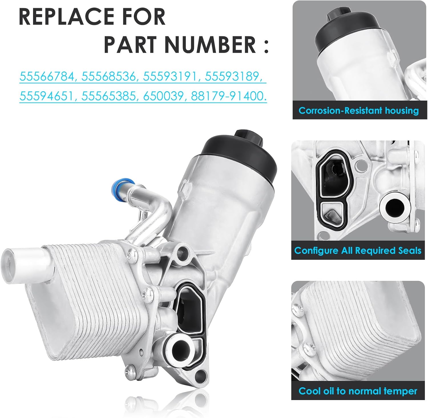 Replaces for Part Number: for 55566784, 55568536, 55593191, 55593189, 55594651, 55565385, 650039, 88179-91400 Applicable models: for Buick Encore 1.4L 2013 2014 2015 2016 2017 2018 2019 2020 2021 oil cooler & filter housing assembly for Chevrolet Cruze 1.4L 2011 2012 2013 2014 2015 oil cooler & filter housing assembly for Chevrolet Cruze Limited 1.4L 2016 oil cooler & filter housing assembly for Chevrolet Sonic 1.4L 2012 2013 2014 2015 2016 2017 2018 2019 2020 oil cooler & filter housing assembly for Chevrolet Trax 1.4L 2015 2016 2017 2018 2019 2020 2021 oil cooler & filter housing assembly And more suitable models,Please refer to the part number. Package includes: 1* filter cap+1*oil cooler+1*oil filter+6*gaskets. NOTE❗ The accessories and seals are already installed in the product