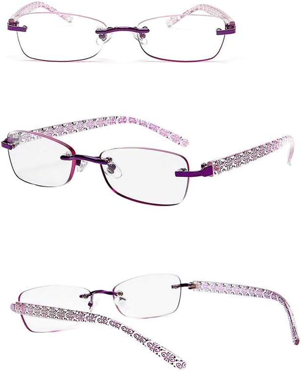 Fashionable and elegant ladies' reading glasses, retro purple patterned temples, coexistence of function and style TR90 temples, good bending resilience, no face clamping Rimless frame Vintage purple temples Anti-scratch design of nose pad Reading glasses weight: 11g Frame Width: 140mm (5.51inch) Lens width: 52mm (2.05inch) Frame Height: 32mm (1.26inch) Temple Length: 138mm (5.43inch) Bridge Width: 18mm (0.7inch) ★ Glasses maintenance ①Your reading glasses will need to be cleaned frequently ②Wash your hands and dry them before you start ③Wash the lens and frame with warm water and a drop of liquid detergent ④Rinse thoroughly with water, then dry the towel with a lint-free cloth ★ Warm reminder Due to the manual measurement of the size, the size has a small error, please understand
