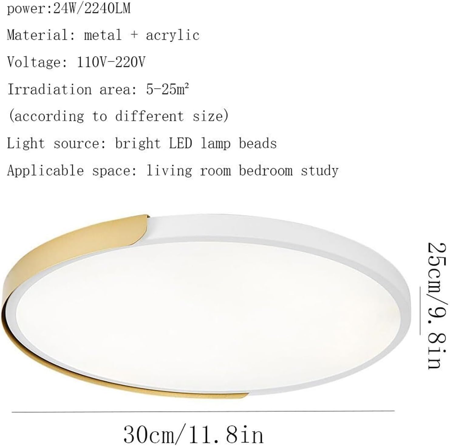 Diameter: 30cm/11.8in, Thickness: 5cm/1.9in, Power: 24W/2240LMDiameter: 40cm/15.7in, Thickness: 5cm/1.9in, Power: 30W/2730LMDiameter: 50cm/19.7in, Thickness: 5cm/1.9in, Power: 38W/3570LMDiameter: 60cm/23.6in, Thickness: 5cm/1.9in, Power: 42W/3930LM1W70-90 lumens.Light source: LEDWorking voltage: 110v.(The US, Canada, Mexico, and Japan default delivery voltage is AC 110V)(The default delivery voltage in Europe and other countries is AC 110v)About dimming:Recommended irradiation area: 5-25 (depending on size)Upgrade your interior with the Nordic LED Flush Mount Ceiling Light, a stylish blend of functionality and design. With its sleek black metal frame and minimalist round shape, this ceiling light adds a touch of elegance to any modern home. The . LED technology ensures long-lasting brightness while reducing electricity costs, making it both efficient and eco-friendly.Emitting a soft, warm 3000K light, this ceiling lamp is perfect for creating a cozy ambiance in cloakrooms, corridors, kitchen islands, and more. Its flush mount design is ideal for spaces with lower ceilings, providing a clean and unobtrusive lighting solution.Crafted from durable materials, this ceiling fixture is built to last, offering both style and reliability. Whether you're looking to enhance your home's decor or need a functional lighting solution for tight spaces, this ceiling light delivers exceptional performance and aesthetic appeal.