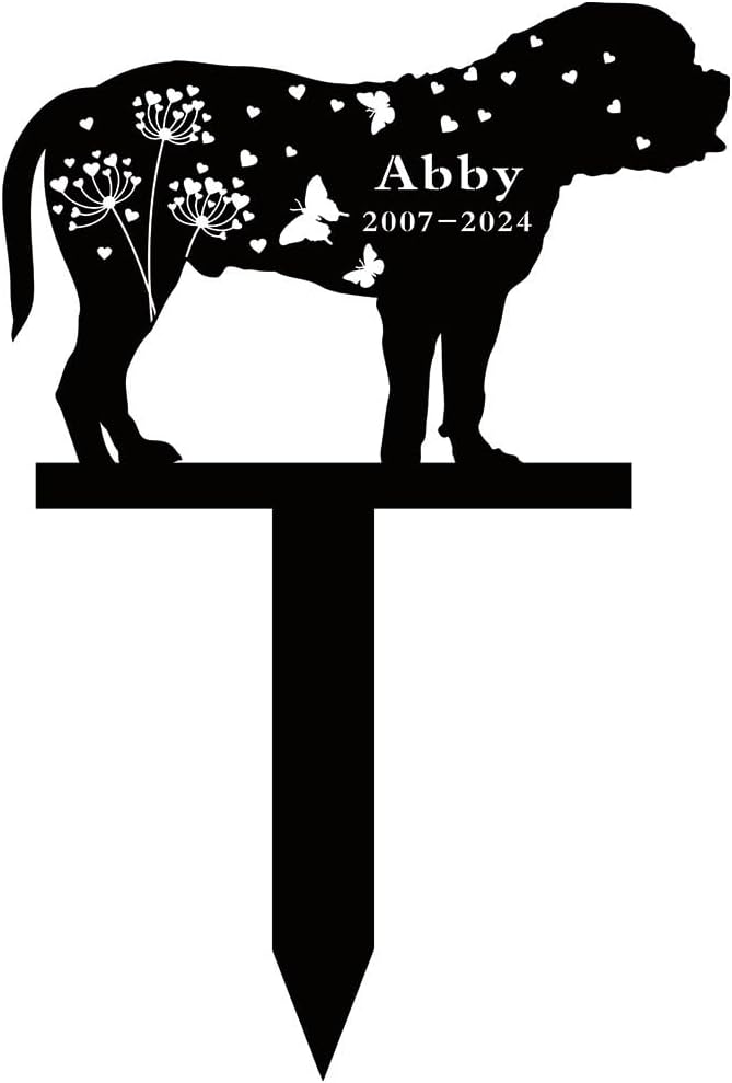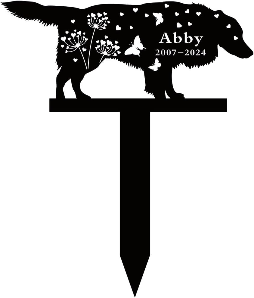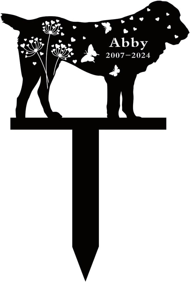 Memory of a beloved canine companion with this elegant garden memorial stake. This black metal stake features a beautiful floral design that gracefully intertwines with the dog's profile. The stake is made from durable metal, making it perfect for outdoor display in gardens, yards, or special memorial spots. The wildflower and flying butterflies details add a touch of natural beauty. This memorial stake can be personalized with dates and dog's name create a lasting remembrance. This thoughtful garden memorial stake as a beautiful way to remember and celebrate the joy and companionship shared with a special four-legged friend.