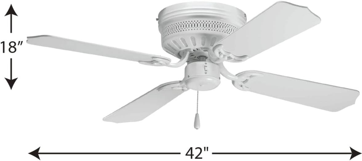 Product Description 42" indoor hugger fan with 4 White blades, White finish, and 11 degree pitch. Hugger style housing permits fan installation on lower ceilings. Powerful AirPro motor features 3-speed control that can also be reversed to provide year-round comfort. Includes a 15-year warranty and is compatible with universal light kits. Select from one of our stylish lighting options to fully coordinate your decor. Can be used to comply with California Title 20. From the Manufacturer Hugger style housing permits fan installation on lower ceilings. Powerful AirPro motor features 3-speed, triple-capacitor control that can also be reversed to provide year-round comfort. Select from one of our stylish lighting options to full coordinate your decor. 42-Inch hugger fan with 4 blades and 3-speed reversible motor. White fan with White blades. 15-year limited warranty 42-Inch Diameter x 8-3/8-Inch Height