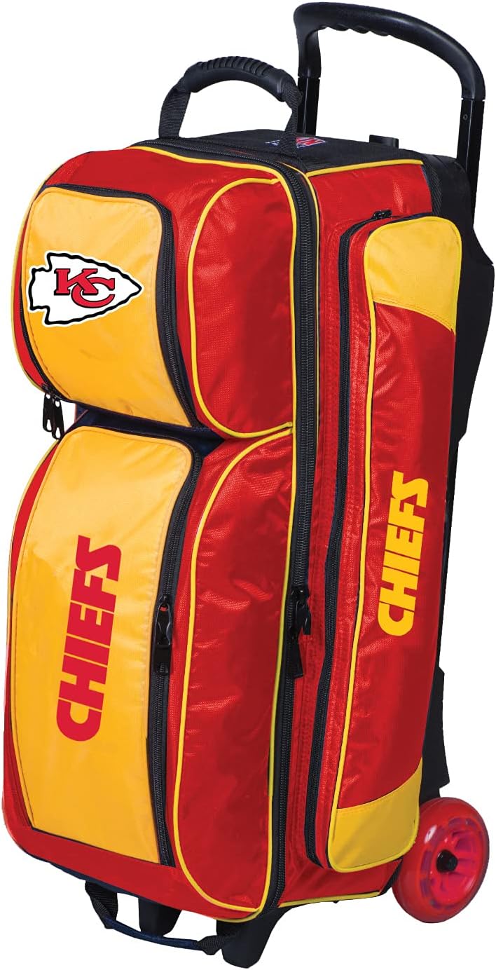 Officially Licensed NFL Three Ball Roller Bowling Bag. Comes with 5" Smooth Kruze urethane wheels for an ultra smooth and quiet ride. Retractable square locking handle that extends to 44". Zippered accessory pockets. Officially licensed embroidered NFL logos. Holds up to size 15 shoes.