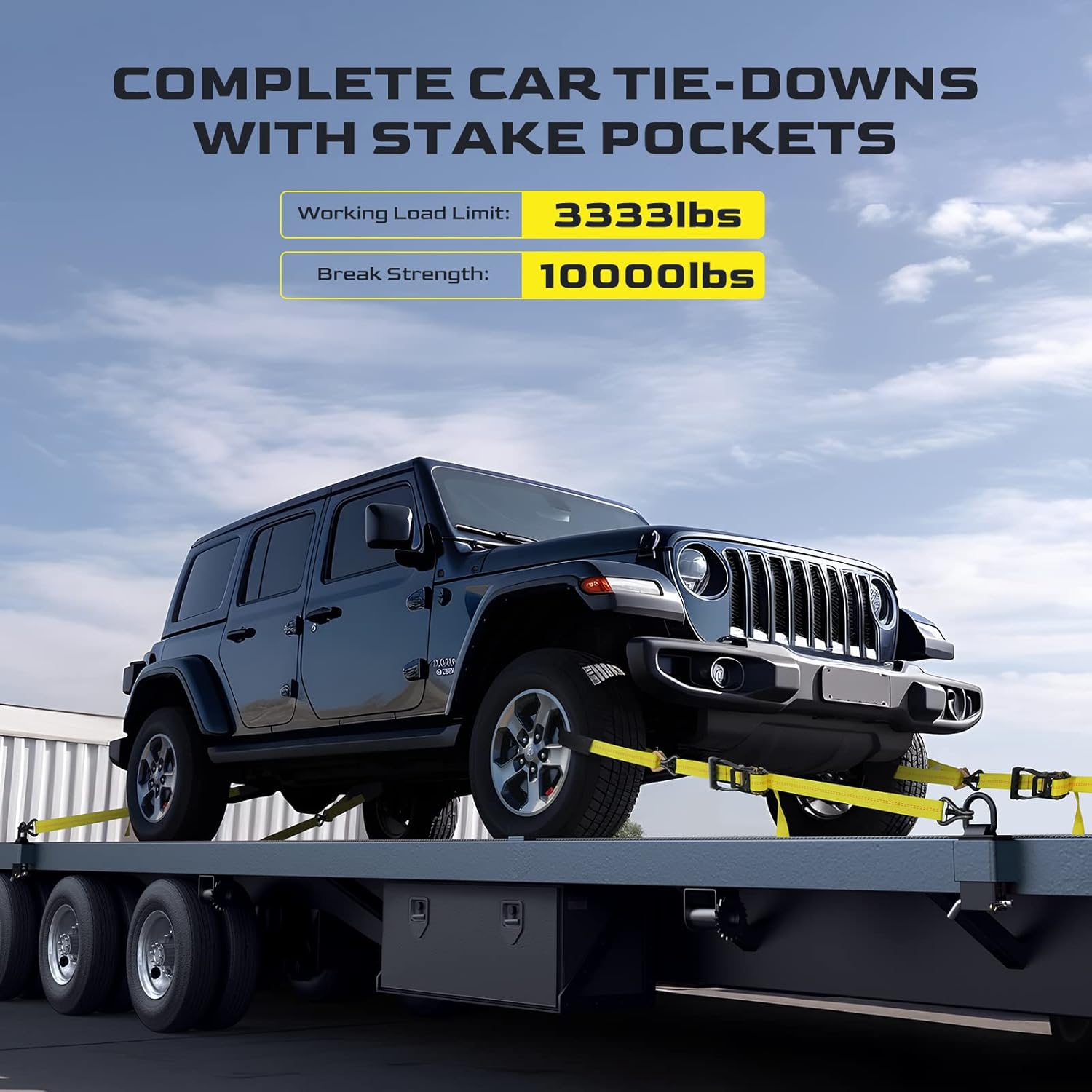 | Included Components | 1 storage bag with zipper closure, 4 pack 36" axle straps, 4 pack 8' J hook ratchet straps, 4 pack stake pockets D-ring |